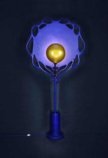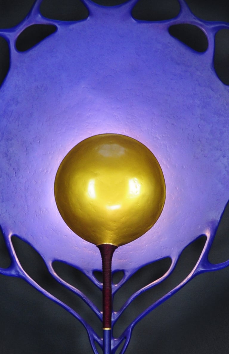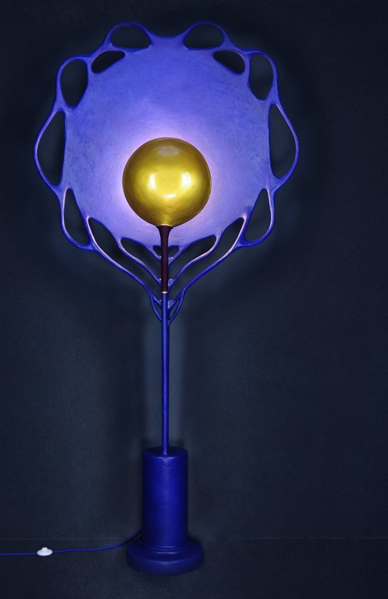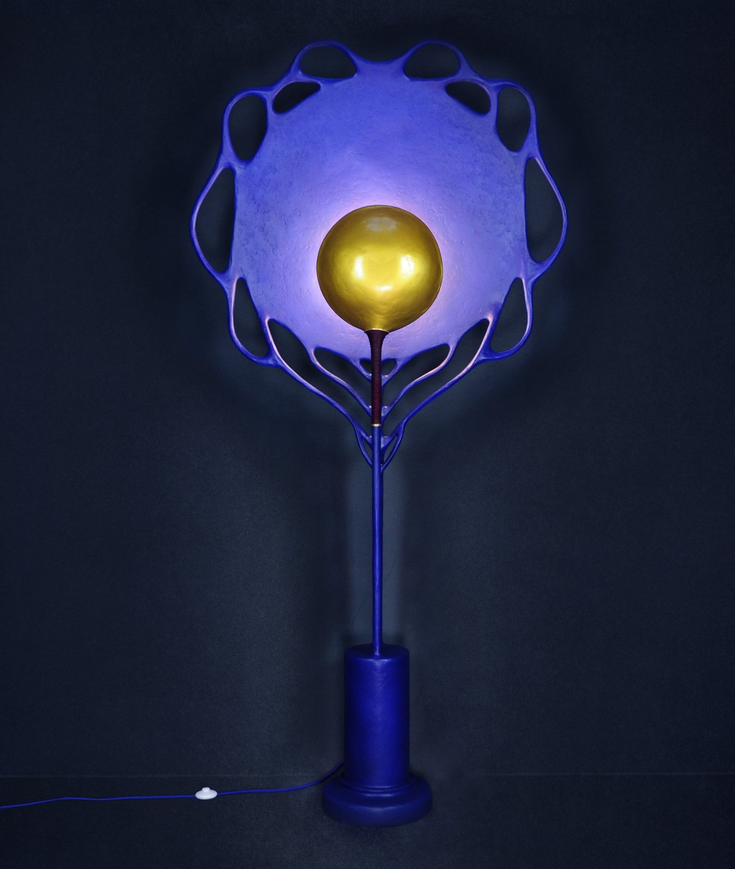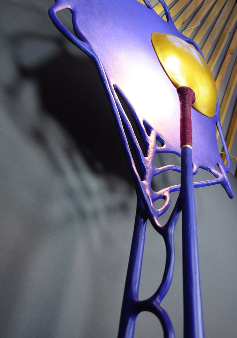 "Bleu Rococo" Voici l’une des plus grandes pièces créée dans l’atelier Joël Bartz. C’est un soleil de nuit qui rayonne une lumière bleue propice à l’endormissement et aux mondes des rêves. Dans une chambre elle saura apaiser les soucis du jour. Comme un attrappe-rêves, elle chasse les cauchemars et enveloppe la nuit grâce à l’envergure de sa couronne. Dans un couloir ou un hall d’entrée spacieux et luxueux, implantée comme un arbre, elle impose le respect avec bienveillance. Elle évoque doucement le souvenir et la grandeur des mythes et spiritualités d’antiques civilisations.