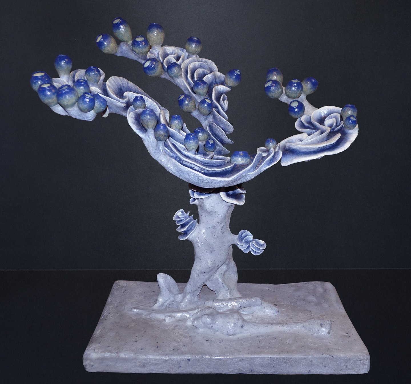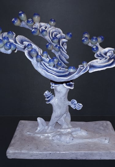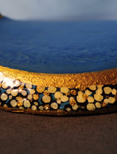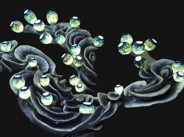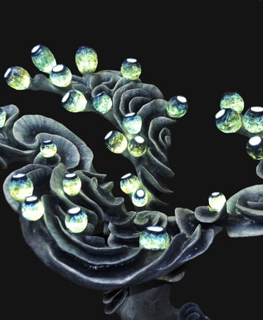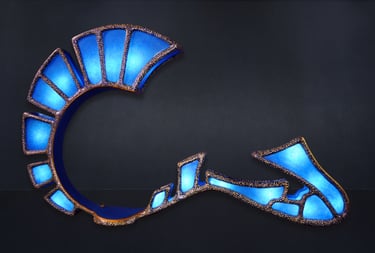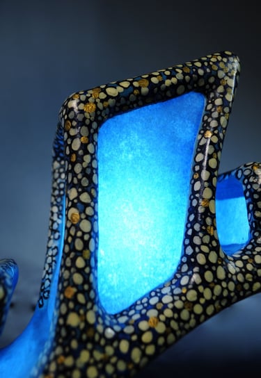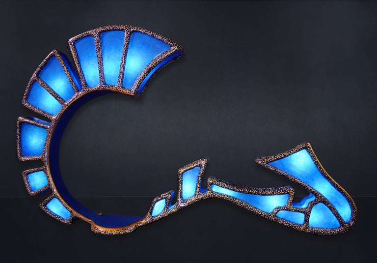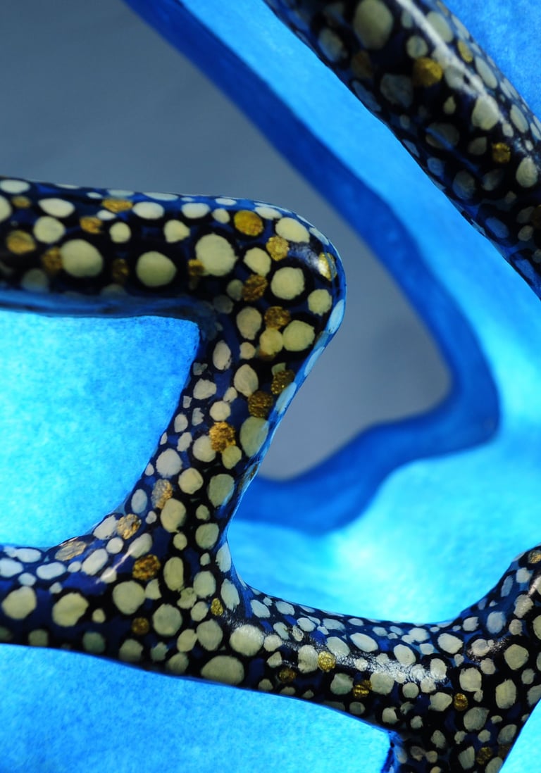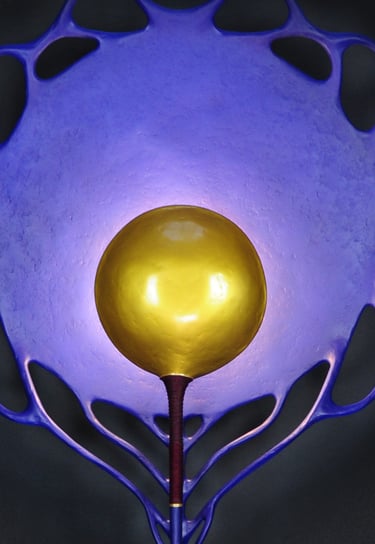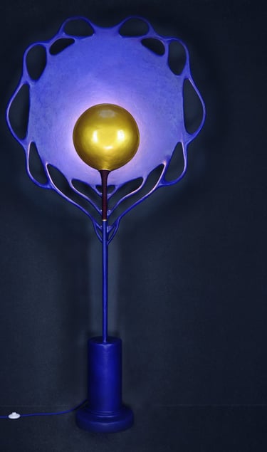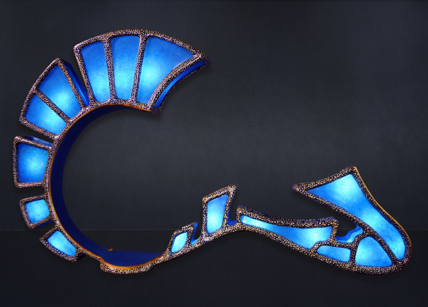 "Bleu Rococo" Voici l’une des plus grandes pièces créée dans l’atelier Joël Bartz. C’est un soleil de nuit qui rayonne une lumière bleue propice à l’endormissement et aux mondes des rêves. Dans une chambre elle saura apaiser les soucis du jour. Comme un attrappe-rêves, elle chasse les cauchemars et enveloppe la nuit grâce à l’envergure de sa couronne. Dans un couloir ou un hall d’entrée spacieux et luxueux, implantée comme un arbre, elle impose le respect avec bienveillance. Elle évoque doucement le souvenir et la grandeur des mythes et spiritualités d’antiques civilisations.