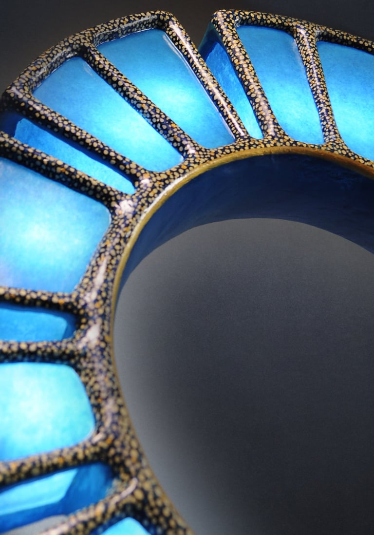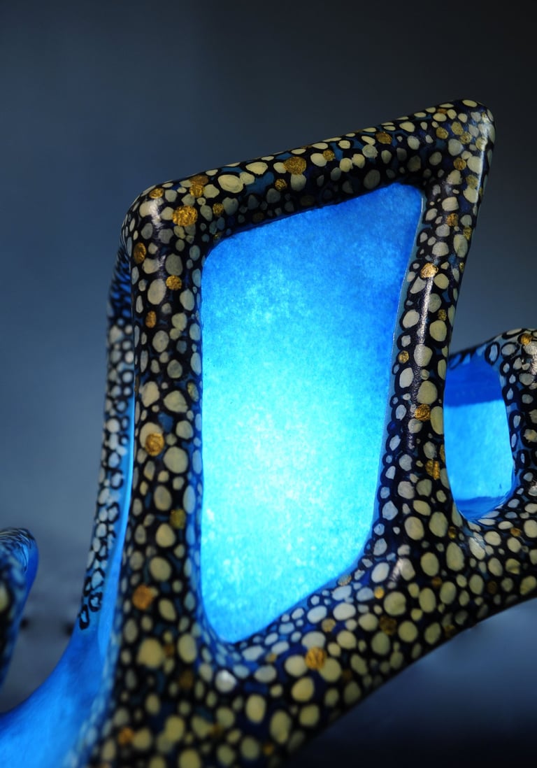 D’un bleu éclatant, son style hybride fusionne avec élégance pop et art déco. Tout comme la sculpture a été soigneusement modelé, son chemisage fut entièrement réalisé à main levée.