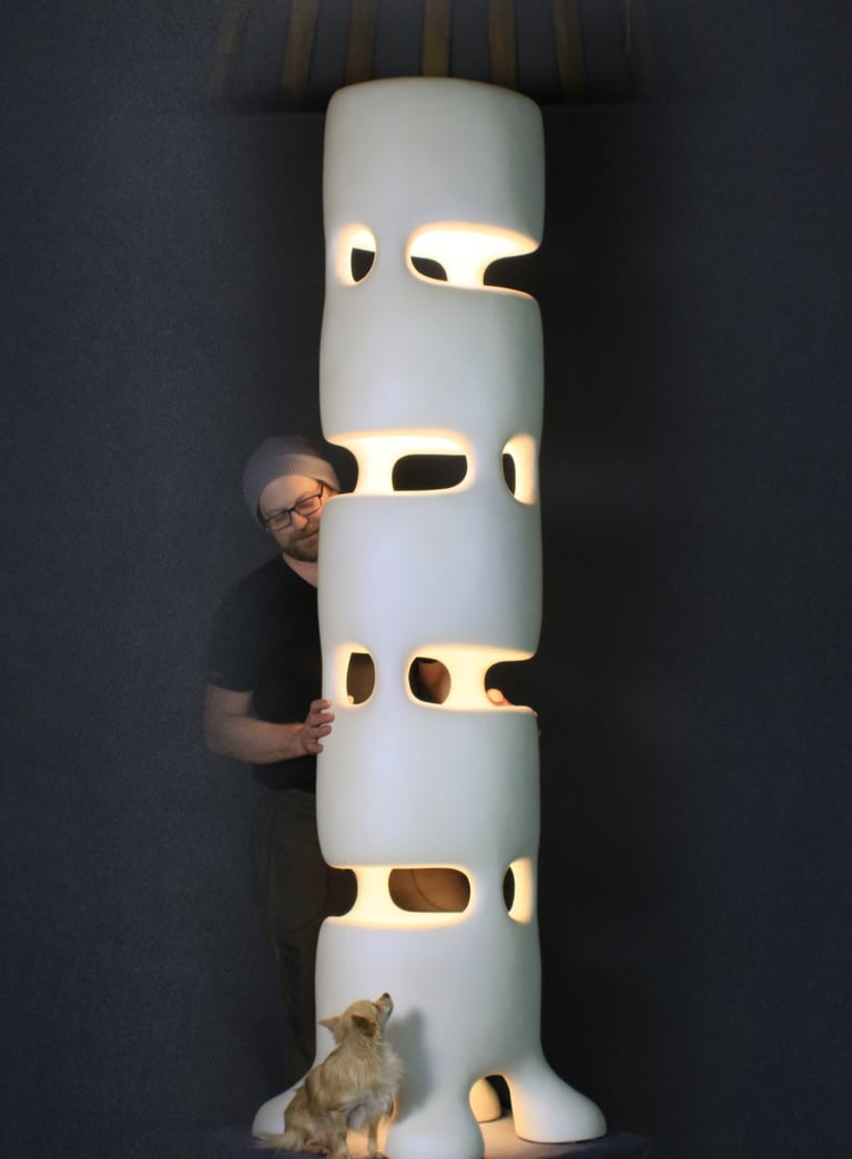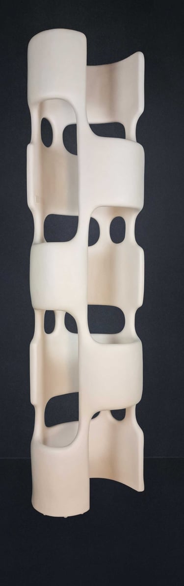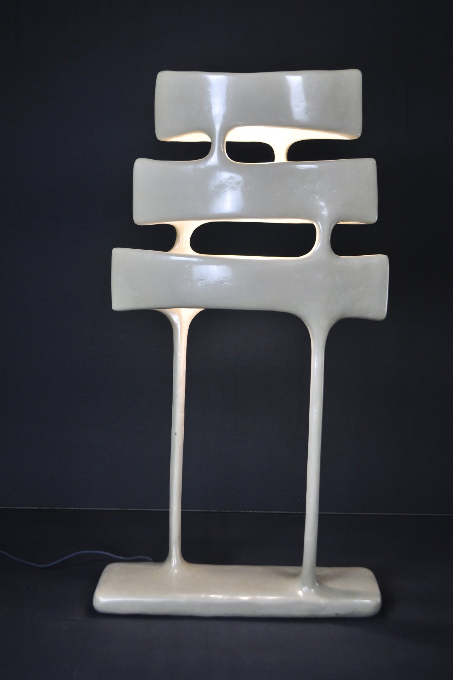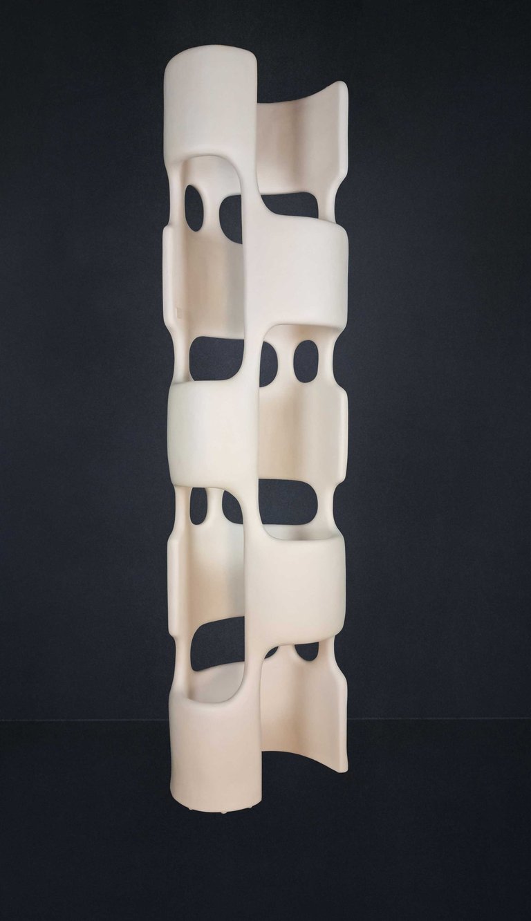 Babel est une grande tour lumineuse et voluptueuse. Ses plusieurs étages évoquent l'envergure des grattes ciel et le mythe de Babel. Elle pourrait continuer son ascension jusqu’à l'infinie. Portée par des pieds sculptés dans un style presque art déco, ses formes rondes lui donne un air troglodyte. Les finitions soignées avec finesse rendent la texture de cette œuvre douce au touché et chaleureuse, elle pourrait faire penser à de l'ivoire.