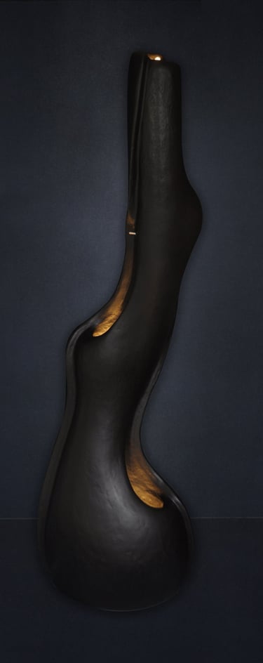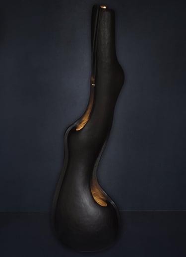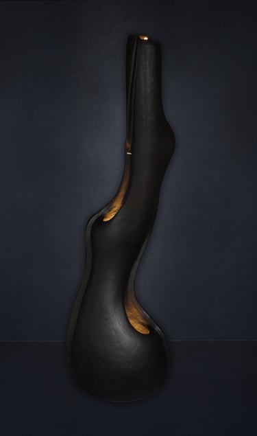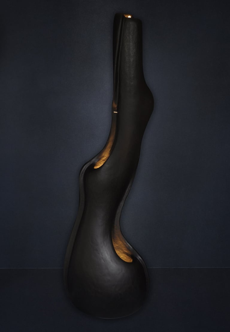 Noire Volcanite ressemble a une voluptueuse flamme noire pétrifiée. En une seconde extraordinaire, elle aurait été saisi dans un instant unique et figé pour l’éternité. Sa force scénique réside dans le fait que nous pouvons facilement l’imaginer danser, comme si elle contenait encore en elle tout son potentiel de mouvements ondulatoires. Intense et sensuelle, elle plonge avec ravissement le spectateur dans une douce béatitude.