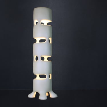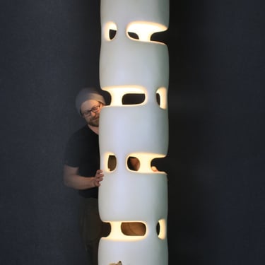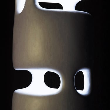 Babel -1 se dresse telle une tour lumineuse et voluptueuse, entre gratte-ciel et mythe de Babel,comme si son ascension pouvait se prolonger au‑delà du visible. Ses pieds sculptés et ses formes arrondies, presque troglodytiques, lui donnent une présence à la fois solide et organique. La surface, travaillée avec finesse, offre une texture douce et chaleureuse, proche de l’ivoire, invitant à ressentir pleinement les volumes et la lumière.